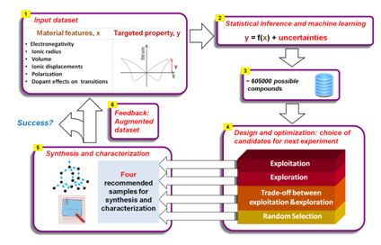 机器学习技术被认为可以从大量材料科学的数据中通过算法搜索隐藏于其中的重要信息,甚至是物理规律,进而实现材料性能的快速优化。西安交大材料学院科研人员提出了一个基于主动学习技术的材料设计方法,并应用于加速设计开发新型压电材料。这一设计思路是一个由数据采集、统计模型、实验设计、结果反馈组成的循环回路;通过对回路的多次循环,实现对材料目标性能的快速优化。
